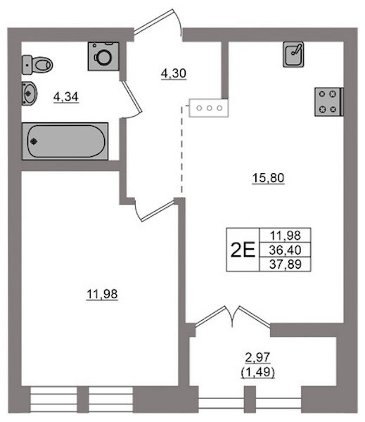 Однокомнатная квартира на 3-ем этаже 37,89 кв.м