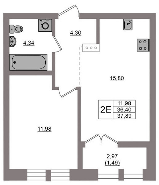 Однокомнатная квартира на 5-ом этаже 37,89 кв.м