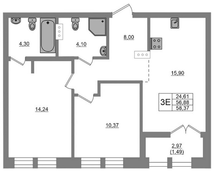 Двухкомнатная квартира на 9-ом этаже 58,37 кв.м
