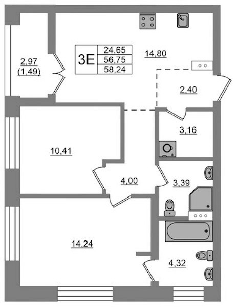 Двухкомнатная квартира на 2-ом этаже 58,24 кв.м