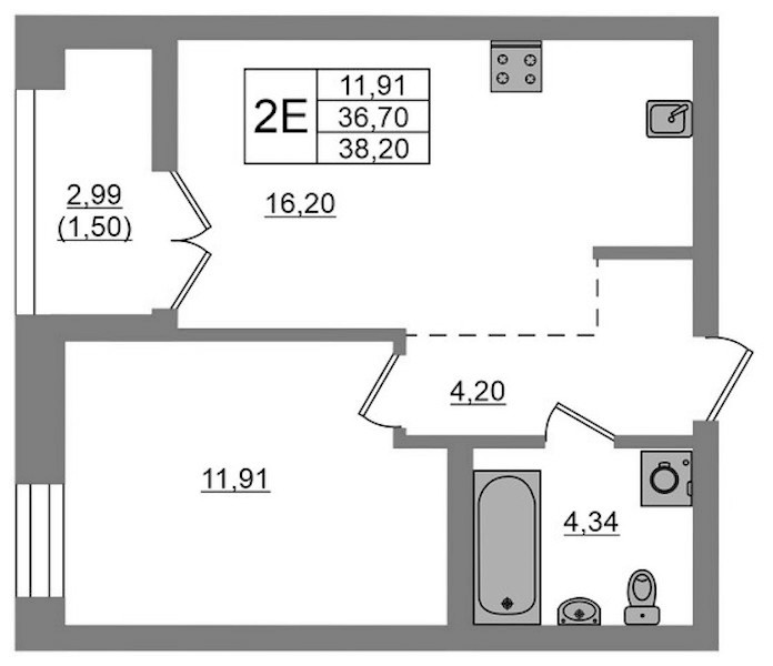 Однокомнатная квартира на 2-ом этаже 38,2 кв.м