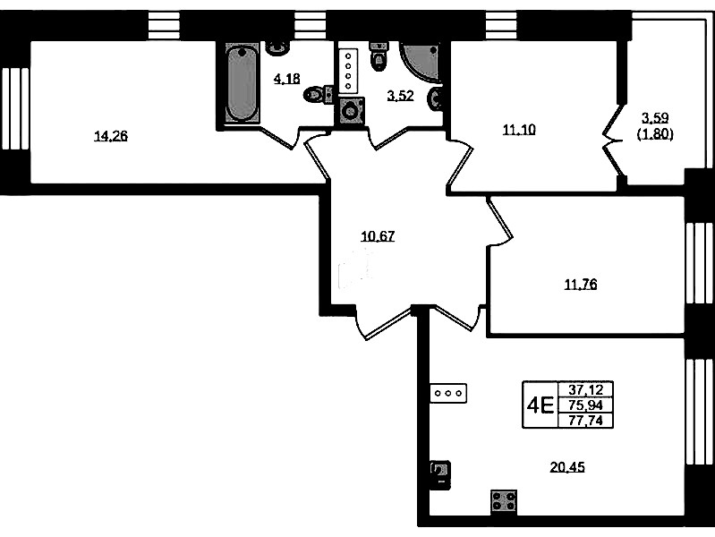 Трёхкомнатная квартира на 7-ом этаже 77,74 кв.м
