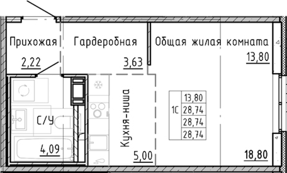 Квартира-студия на 1-ом этаже 28,74 кв.м