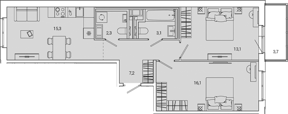 Двухкомнатная квартира на 7-ом этаже 60,7 кв.м