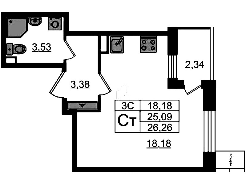 Квартира-студия на 1-ом этаже 25,09 кв.м