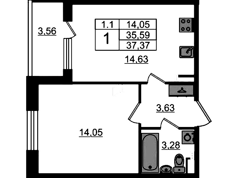 - Площадь кухни14,63 м2