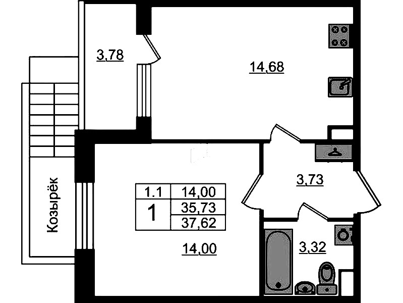 Однокомнатная квартира на 1-ом этаже 35,73 кв.м