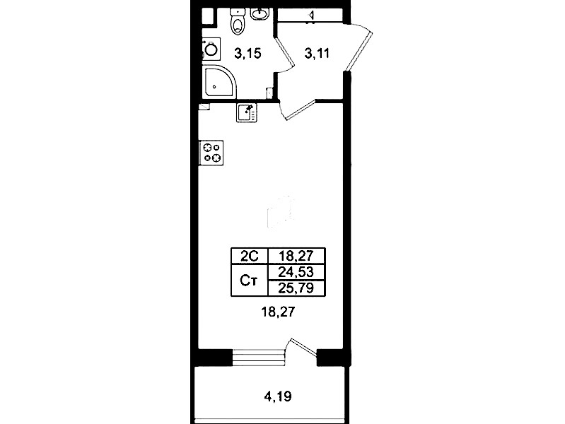Квартира-студия на 3-ем этаже 24,53 кв.м