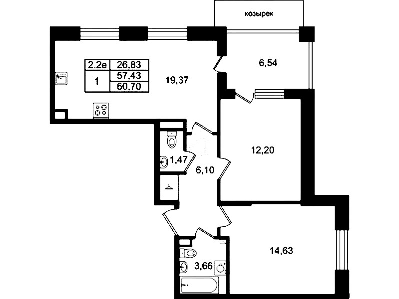 • Площадь57,43 м2