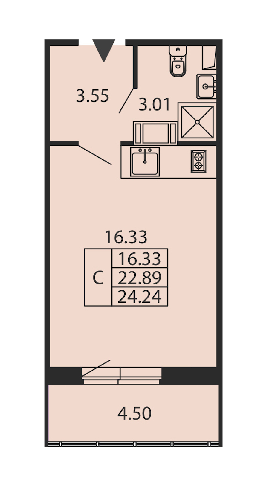 Квартира-студия на 12-ом этаже 22,89 кв.м