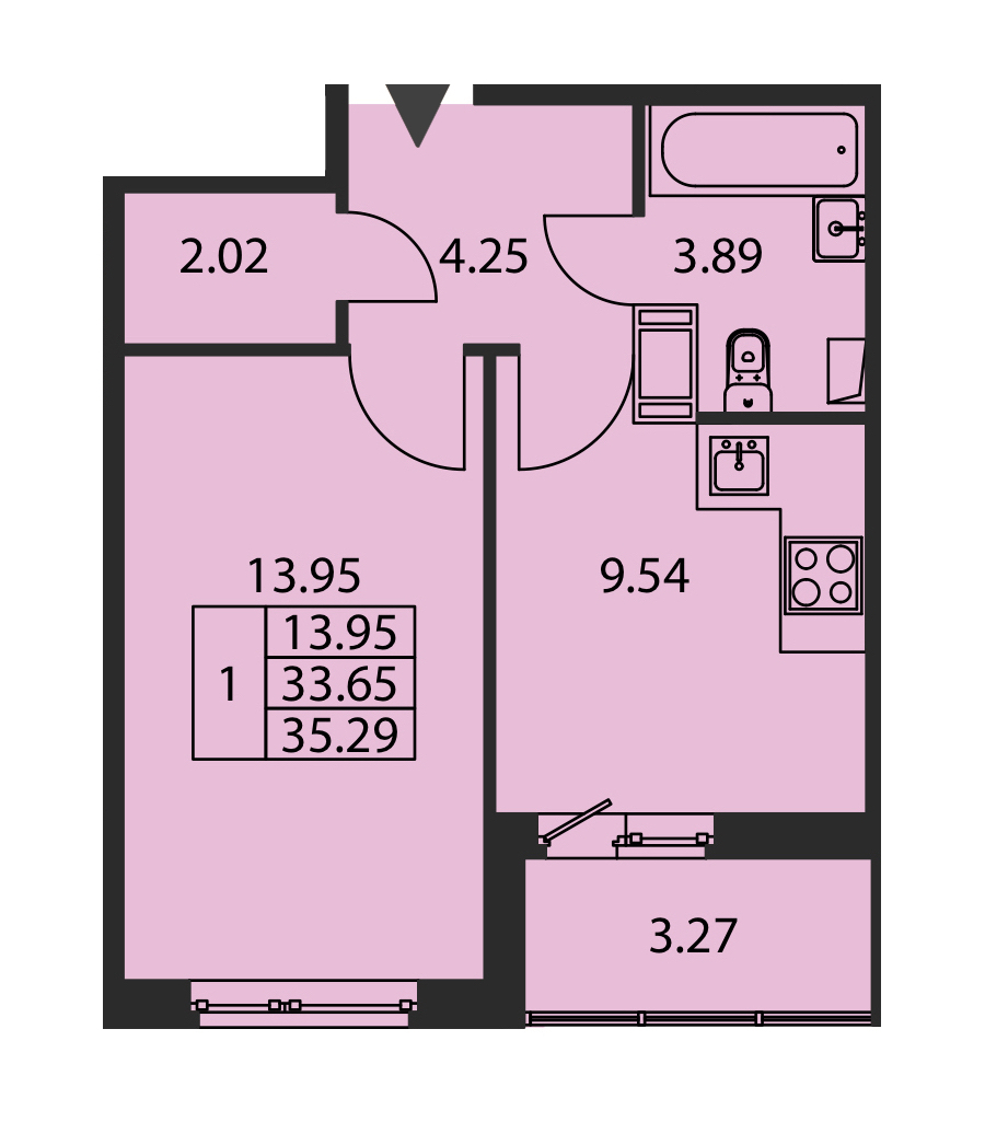 Однокомнатная квартира на 7-ом этаже 33,65 кв.м