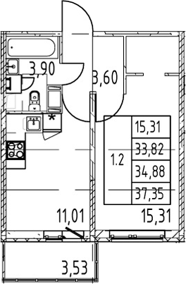 Однокомнатная квартира на 11-ом этаже 33,82 кв.м