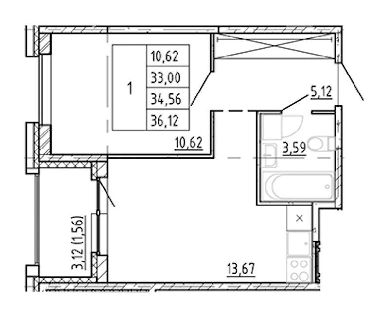 Однокомнатная квартира на 3-ем этаже 33 кв.м