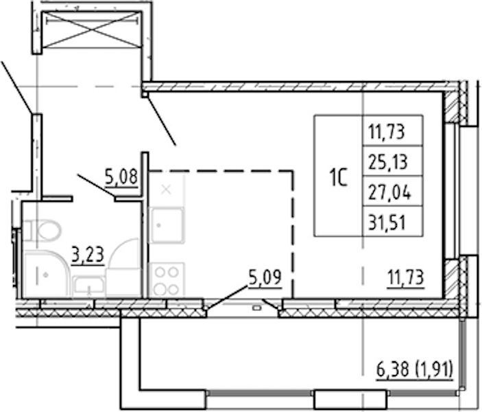 Квартира-студия на 6-ом этаже 25,13 кв.м
