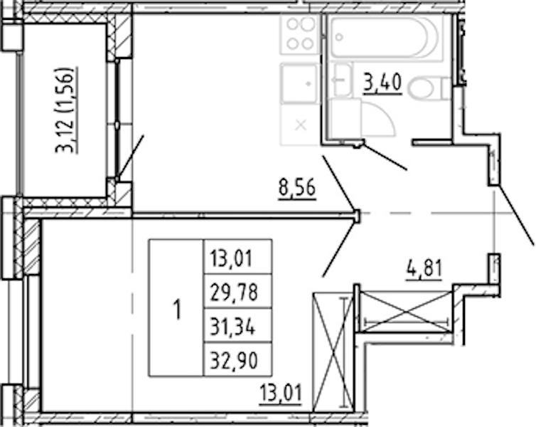 Однокомнатная квартира на 6-ом этаже 29,78 кв.м