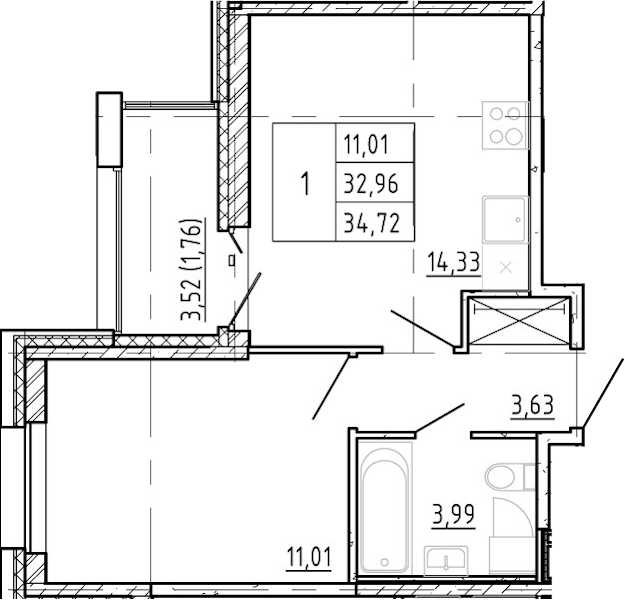 Однокомнатная квартира на 6-ом этаже 33,21 кв.м