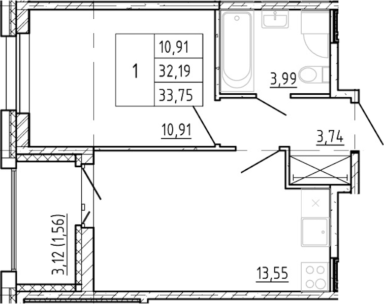 Однокомнатная квартира на 11-ом этаже 32,19 кв.м
