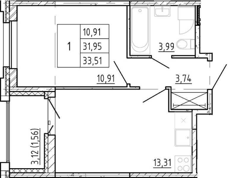 Однокомнатная квартира на 4-ом этаже 31,95 кв.м