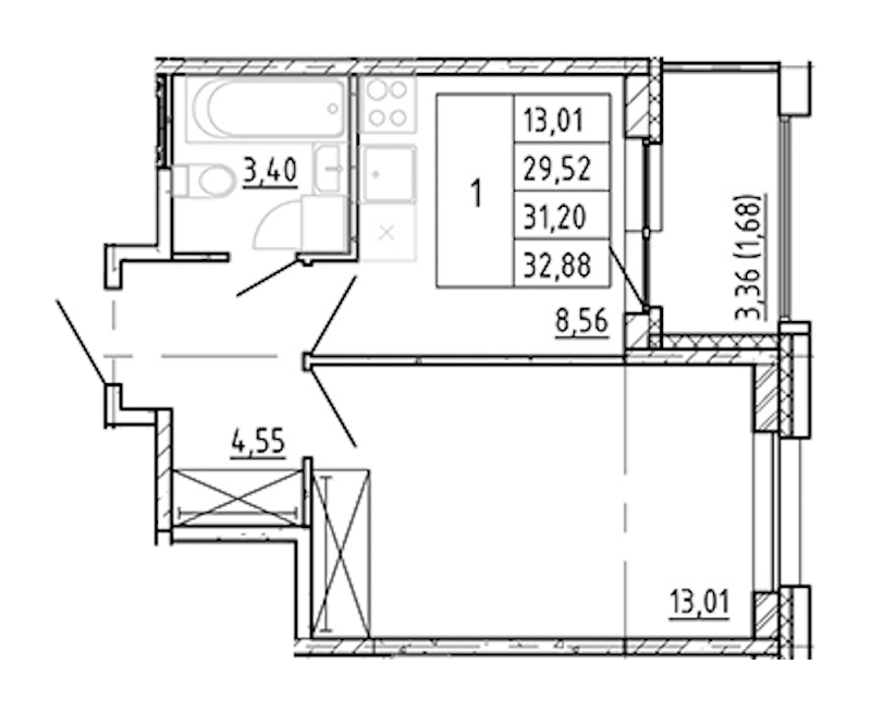 Однокомнатная квартира на 9-ом этаже 29,52 кв.м