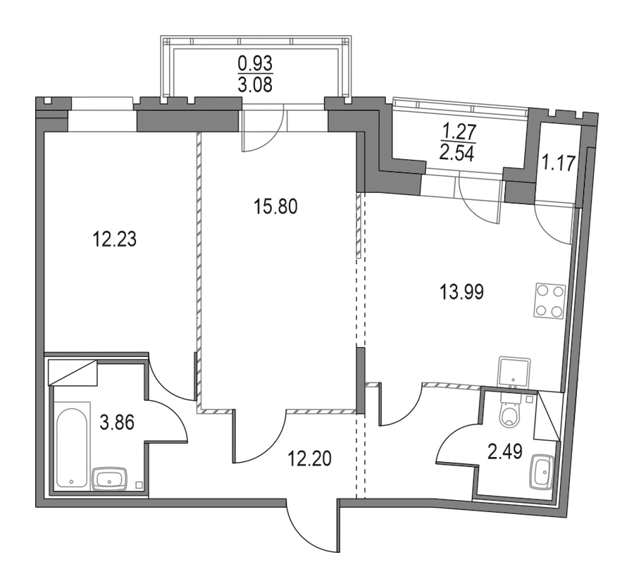 Двухкомнатная квартира на 15-ом этаже 61,49 кв.м