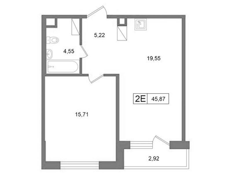 Однокомнатная квартира на 2-ом этаже 45,87 кв.м