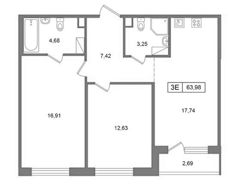 Двухкомнатная квартира на 3-ем этаже 63,98 кв.м
