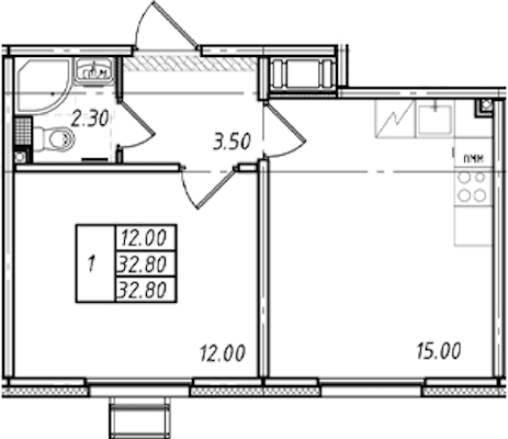Однокомнатная квартира на 13-ом этаже 32,8 кв.м