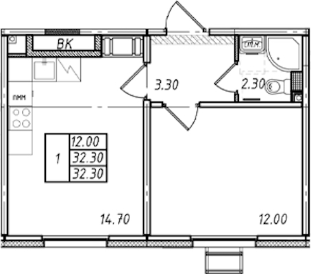 Однокомнатная квартира на 2-ом этаже 32,3 кв.м