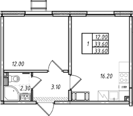 Однокомнатная квартира на 14-ом этаже 33,6 кв.м