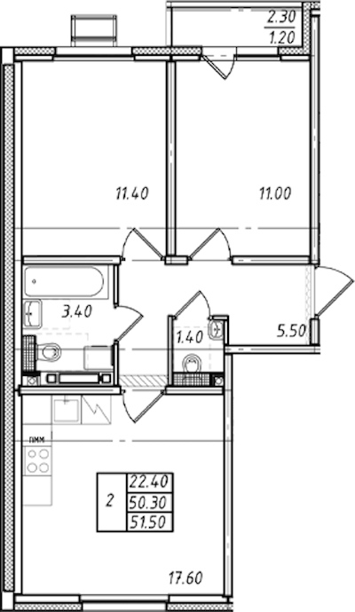 Двухкомнатная квартира на 9-ом этаже 51,5 кв.м