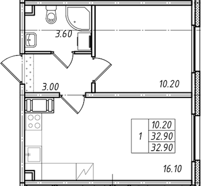 Однокомнатная квартира на 12-ом этаже 32,9 кв.м