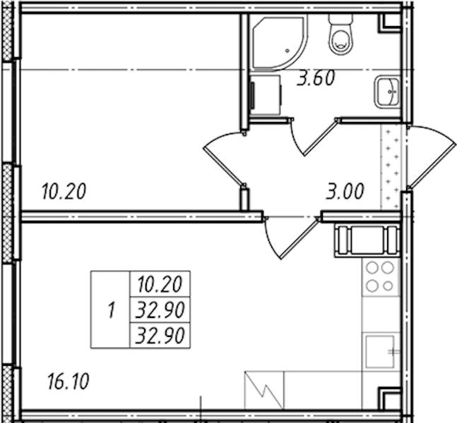 Однокомнатная квартира на 16-ом этаже 32,9 кв.м