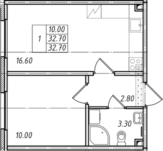Однокомнатная квартира на 2-ом этаже 32,7 кв.м