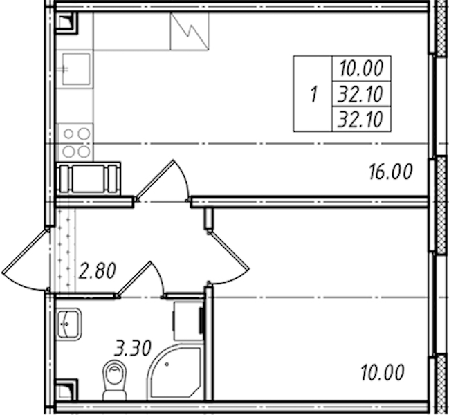 Однокомнатная квартира на 7-ом этаже 32,1 кв.м