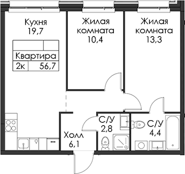 Двухкомнатная квартира на 10-ом этаже 56,7 кв.м