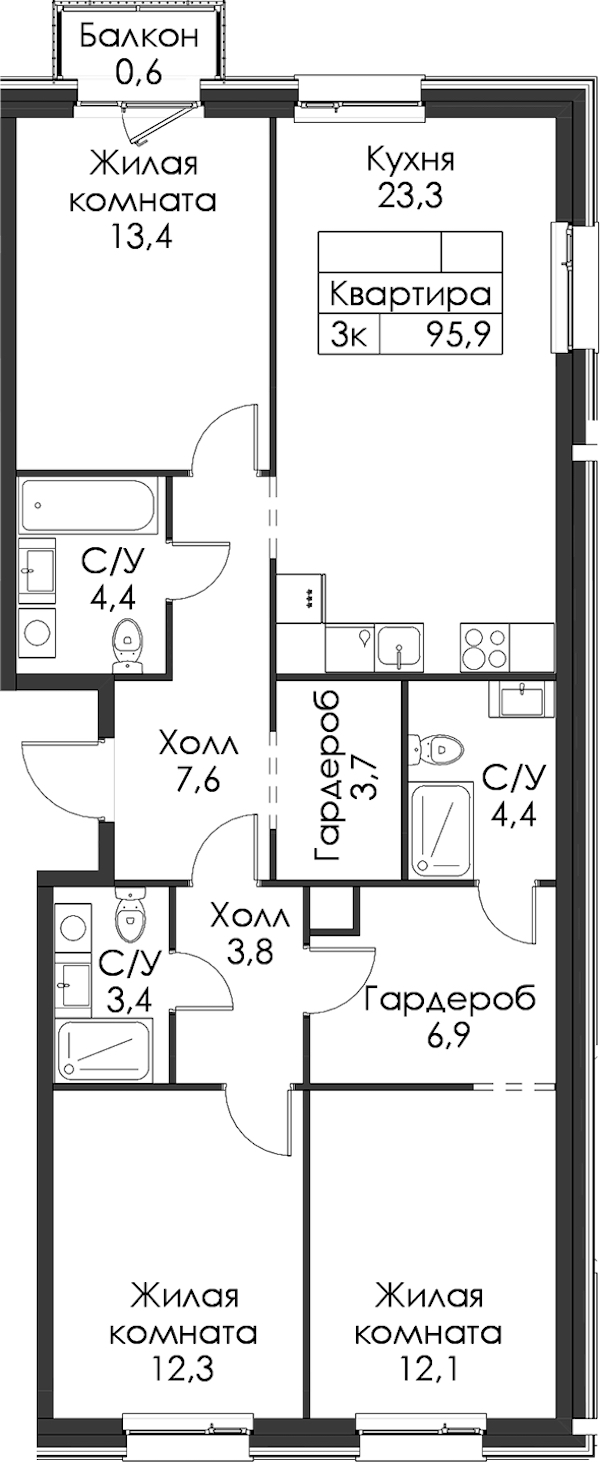 Трёхкомнатная квартира на 9-ом этаже 95,9 кв.м