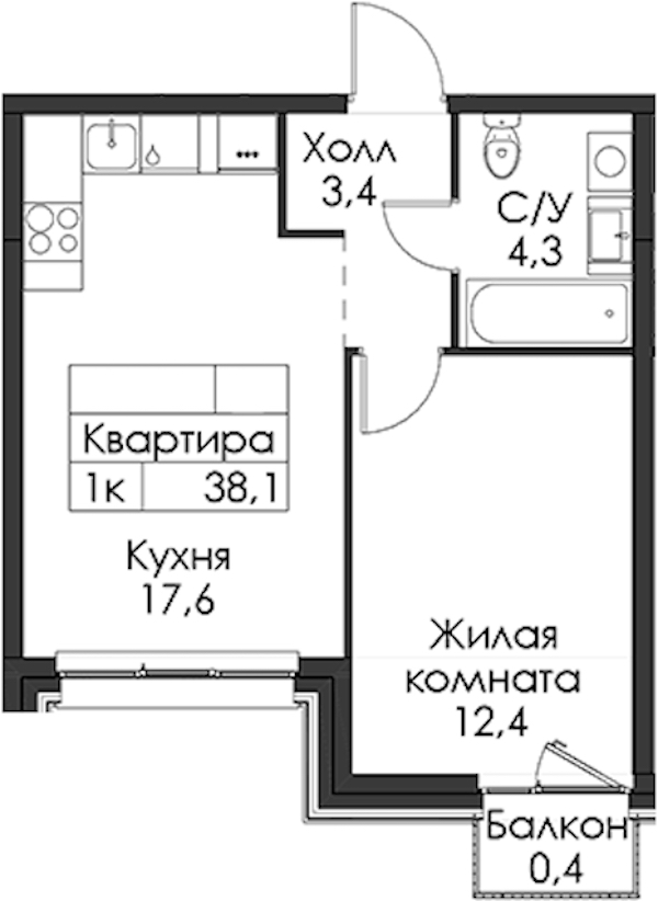 Однокомнатная квартира на 9-ом этаже 38,1 кв.м