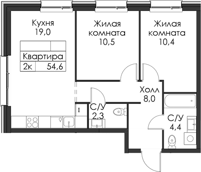 Двухкомнатная квартира на 7-ом этаже 54,6 кв.м