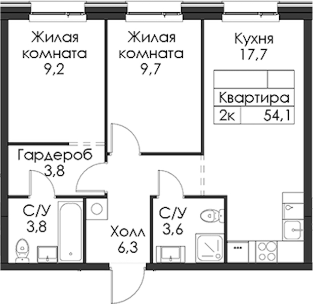 Двухкомнатная квартира на 12-ом этаже 54,1 кв.м