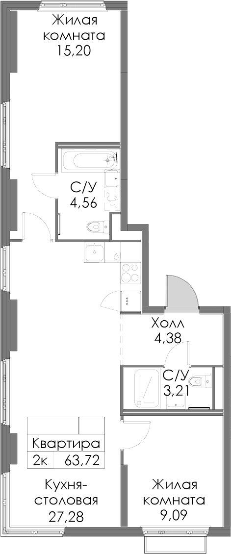 Двухкомнатная квартира на 2-ом этаже 63,72 кв.м