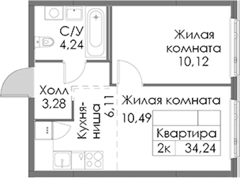 Однокомнатная квартира на 2-ом этаже 34,24 кв.м