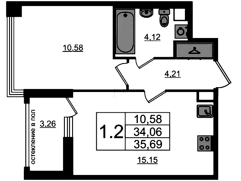 Однокомнатная квартира на 1-ом этаже 34,06 кв.м