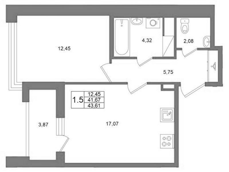 Однокомнатная квартира на 11-ом этаже 41,67 кв.м