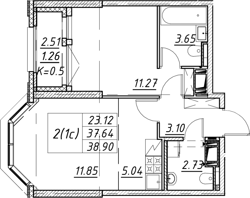 Однокомнатная квартира на 10-ом этаже 38,9 кв.м