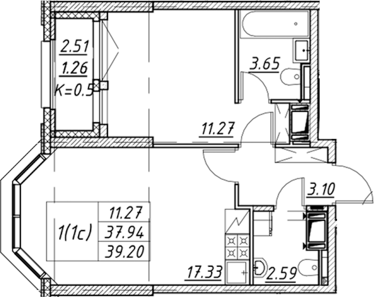 Однокомнатная квартира на 10-ом этаже 39,2 кв.м