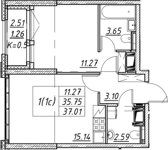 Однокомнатная квартира на 15-ом этаже 37,01 кв.м