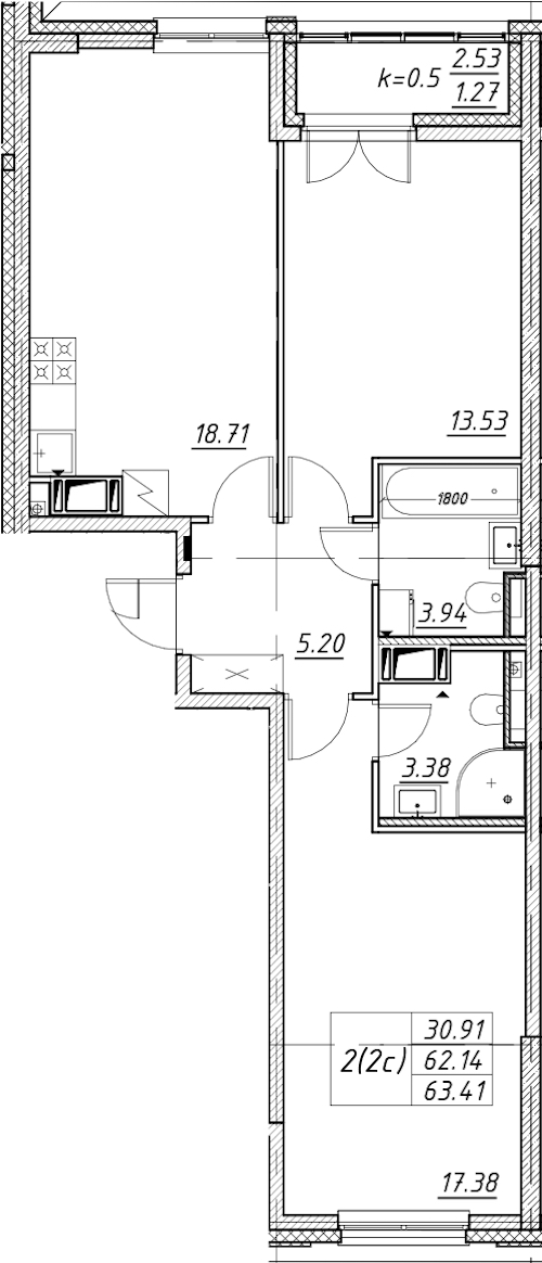 Двухкомнатная квартира на 6-ом этаже 63,41 кв.м
