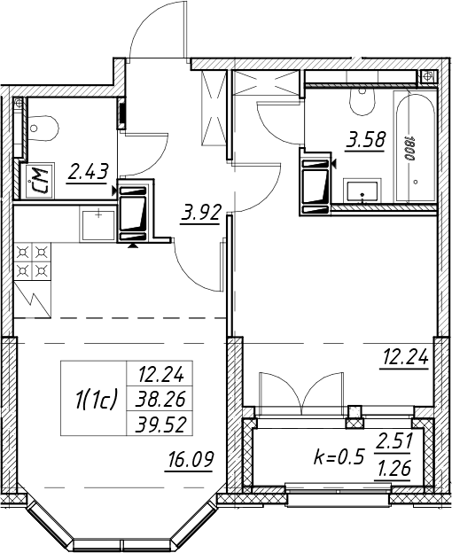 • Площадь кухни16,09 м2