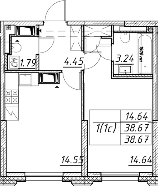 Однокомнатная квартира на 5-ом этаже 38,67 кв.м