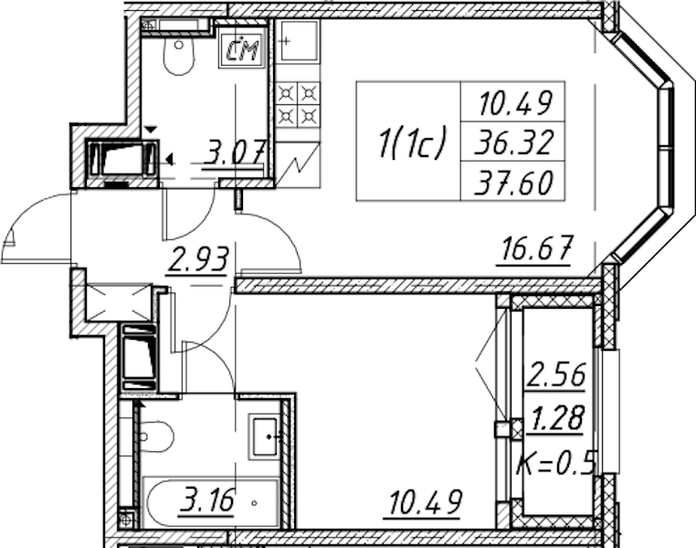 - Площадь37,6 м2